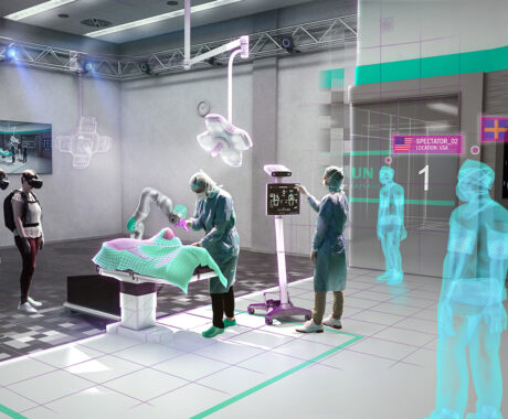 Simulation of care situations in virtual patient rooms.