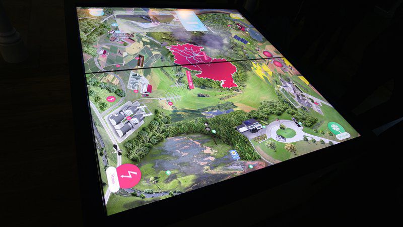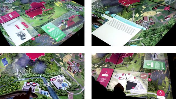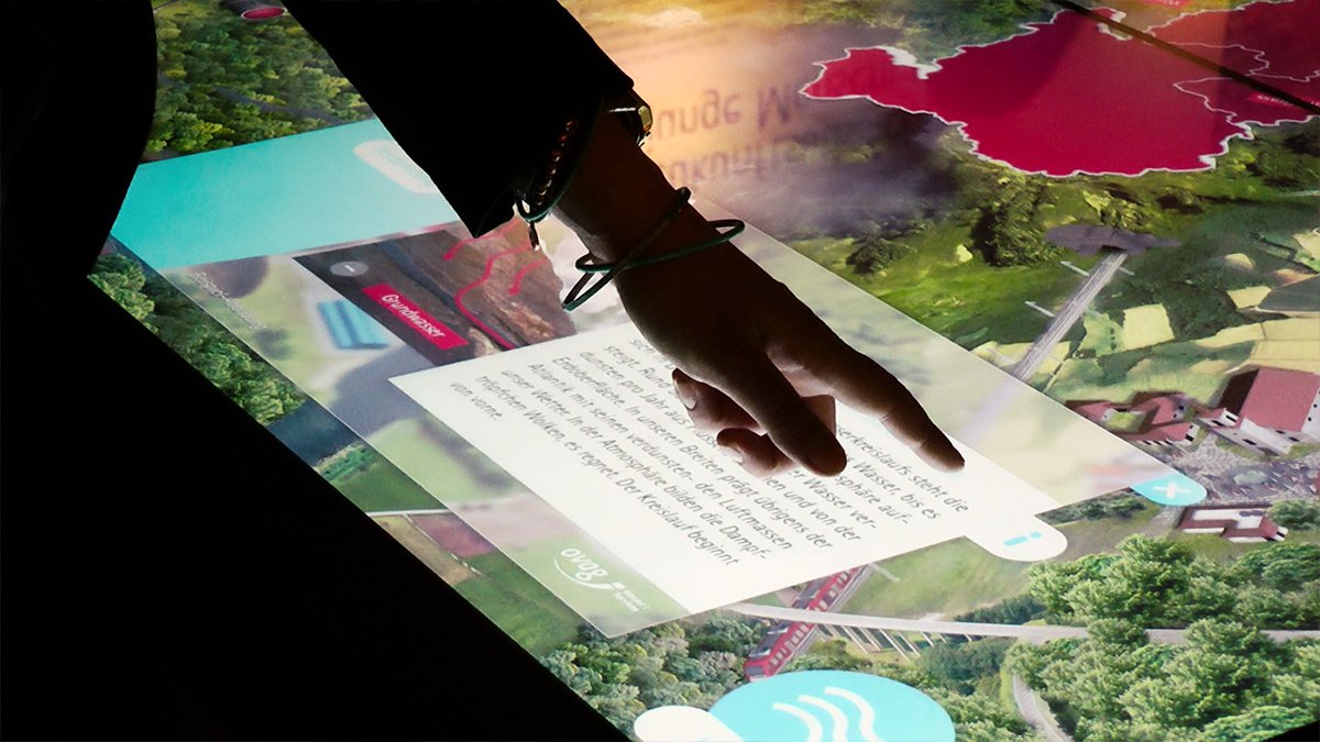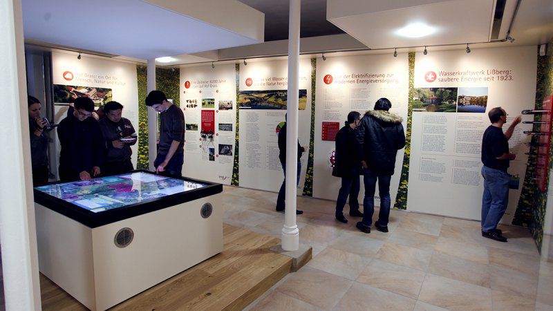 How does electricity reach the socket? How does our water supply cycle work? Visitors interact with an animated 3D world on a 1.5 by 2 meter multitouch table, the centerpiece of the Technikum. In this way, they playfully learn about modern water and energy supply and environmental protection.