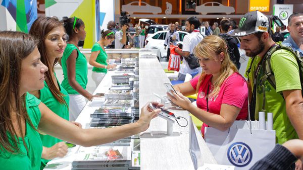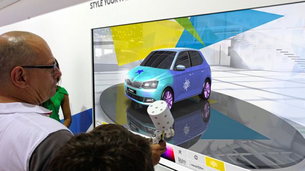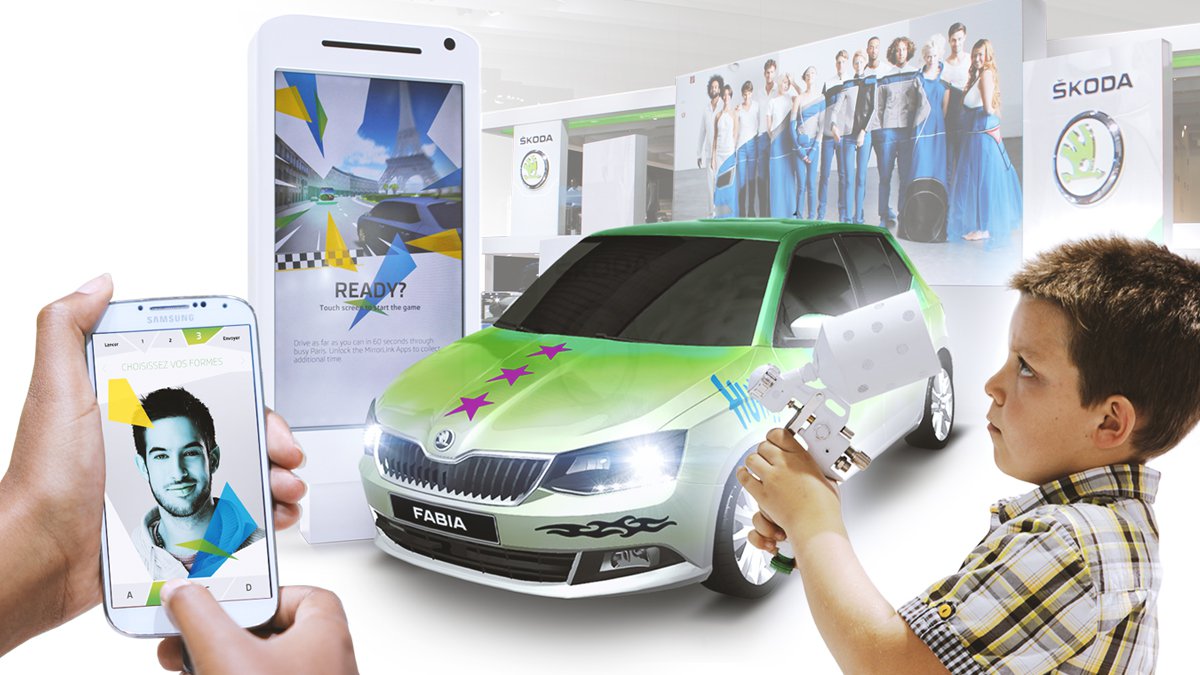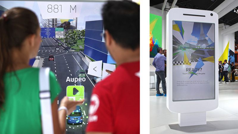 Visitors to the trade fair gain their first impressions of the ŠKODA Fabia on an oversized smartphone. They steer the vehicle through 3D reconstructed streets of Paris in a game and collect ŠKODA apps that determine their high score.