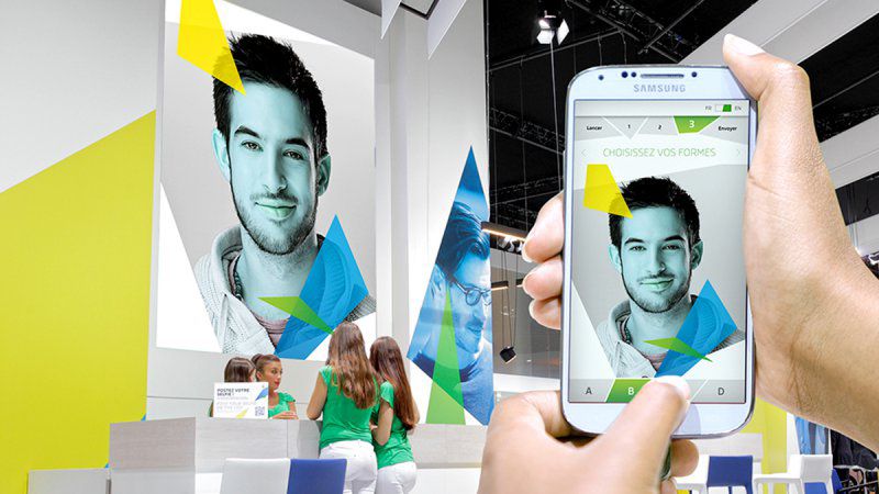 Using an app on their smartphone or on one that is on display, visitors create their own selfie, which is then broadcast on a 3 × 4 meter screen. An interactive crowd puller.