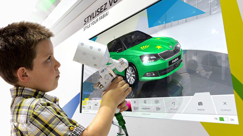 At the 3D design configurator, visitors design their dream vehicle on a high-resolution 84″ screen. Using a real paint gun, they digitally design their dream car with colors and patterns. The spray gun reacts realistically to distance and angle of tilt. ŠKODA publishes selected styles on its creative platforms.