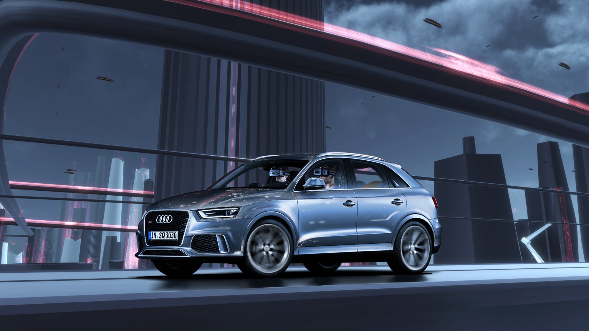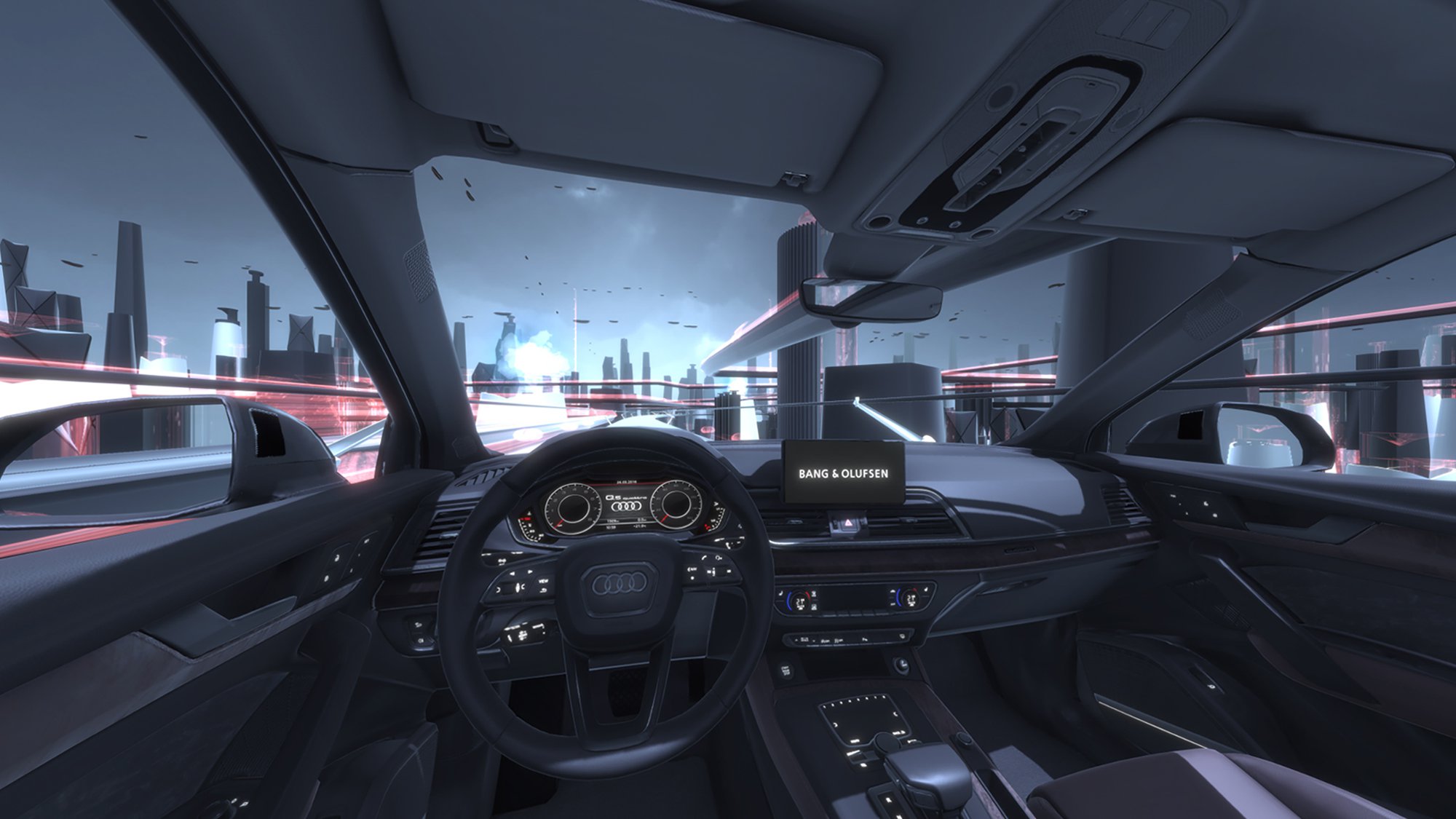 Fahrer und Beifahrer erleben während der dreiminütigen Testfahrt ein interaktives Spektakel: Sie cruisen mit der VR-Brille durch eine 3D-Echtzeit-Visualisierung des satten Sounds aus den Bang & Olufsen Boxen.