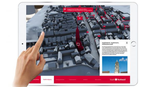3D-Modell, Text, Bild, Video, 360-Grad-Medien: Unsere App wechselt nahtlos zwischen den Wissensformaten und verbindet sie zu einer großen Geschichte – auch über das Jubiläum hinaus. Das 3D-Modell der Stadt kann aktualisiert und neue Inhalte können ergänzt werden. Die App ist der Startpunkt für Rottweils 3D-Marketing.