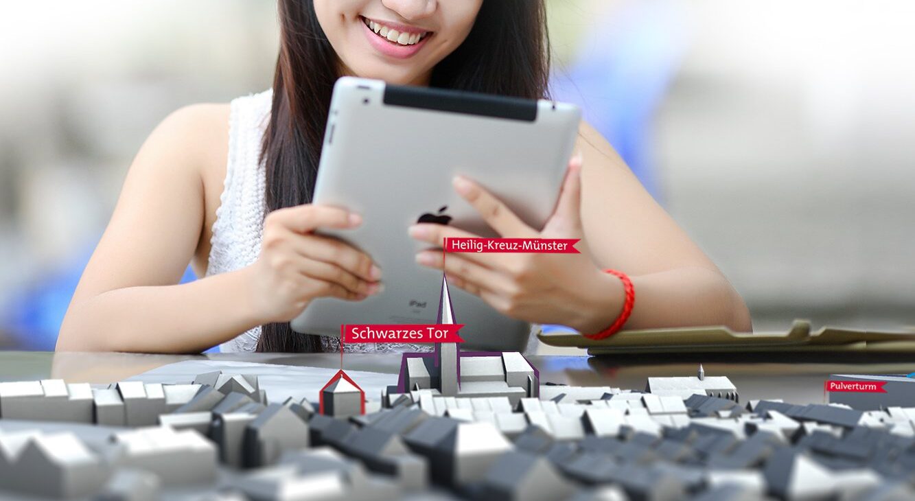 Interessierte bewegen sich per Smartphone oder Tablet durch ein virtuelles Stadtmodell. Mit Augmented Reality entdecken sie Rottweil aus vielen Perspektiven, erfahren mehr über historische Gebäude und Rottweils beeindruckende Aussichtstürme, von denen sie einen fotorealistischen 360-Grad-Rundumblick genießen können.