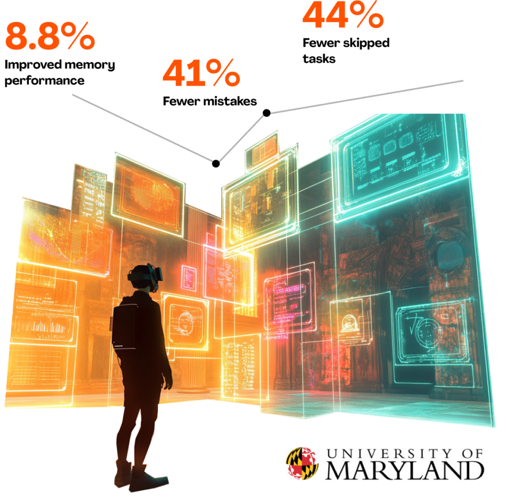 Die Maryland-Studie zeigt, dass VR-basierte Gedächtnispaläste die Erinnerungsleistung deutlich verbessern. Nutzer von VR-Headsets erzielten eine 8,8 % höhere Erinnerungsrate, machten 41 % weniger Fehler und übersprangen 44 % weniger Aufgaben. Ihr Vertrauen in die Antworten stieg auf 9,4 (vs. 9,1 am Desktop). Teilnehmer, die zuerst VR nutzten, schnitten schlechter ab, wenn sie anschließend auf den Desktop wechselten.